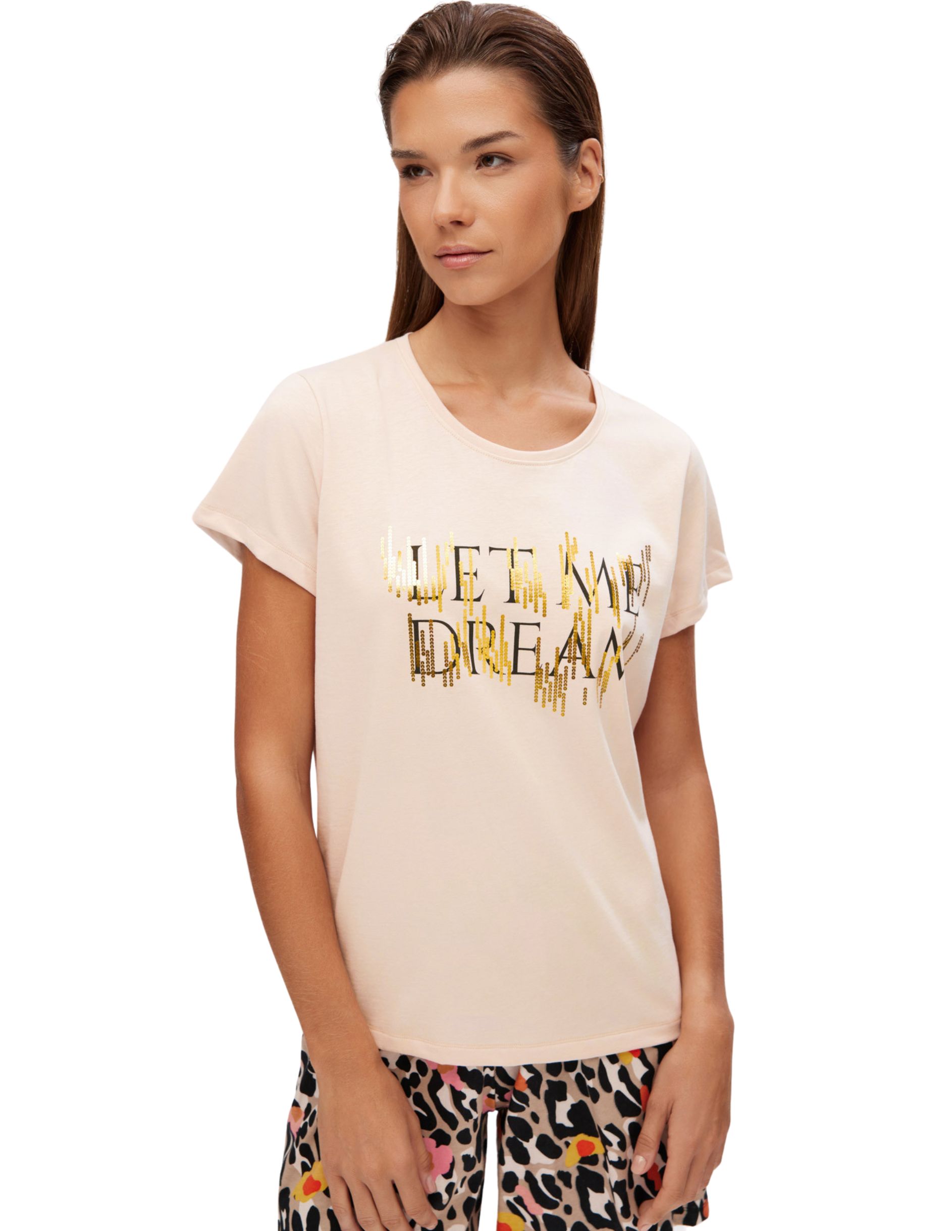 Η μπεζ πυτζάμα Minerva με κοντομάνικο μπλουζάκι και χρυσή στάμπα “Let Me Dream” ξεχωρίζει με το εντυπωσιακό λεοπάρ σορτς. Από 100% βαμβάκι, είναι ιδανική για άνεση και στυλ τις καλοκαιρινές νύχτες ή τις στιγμές ξεκούρασης.