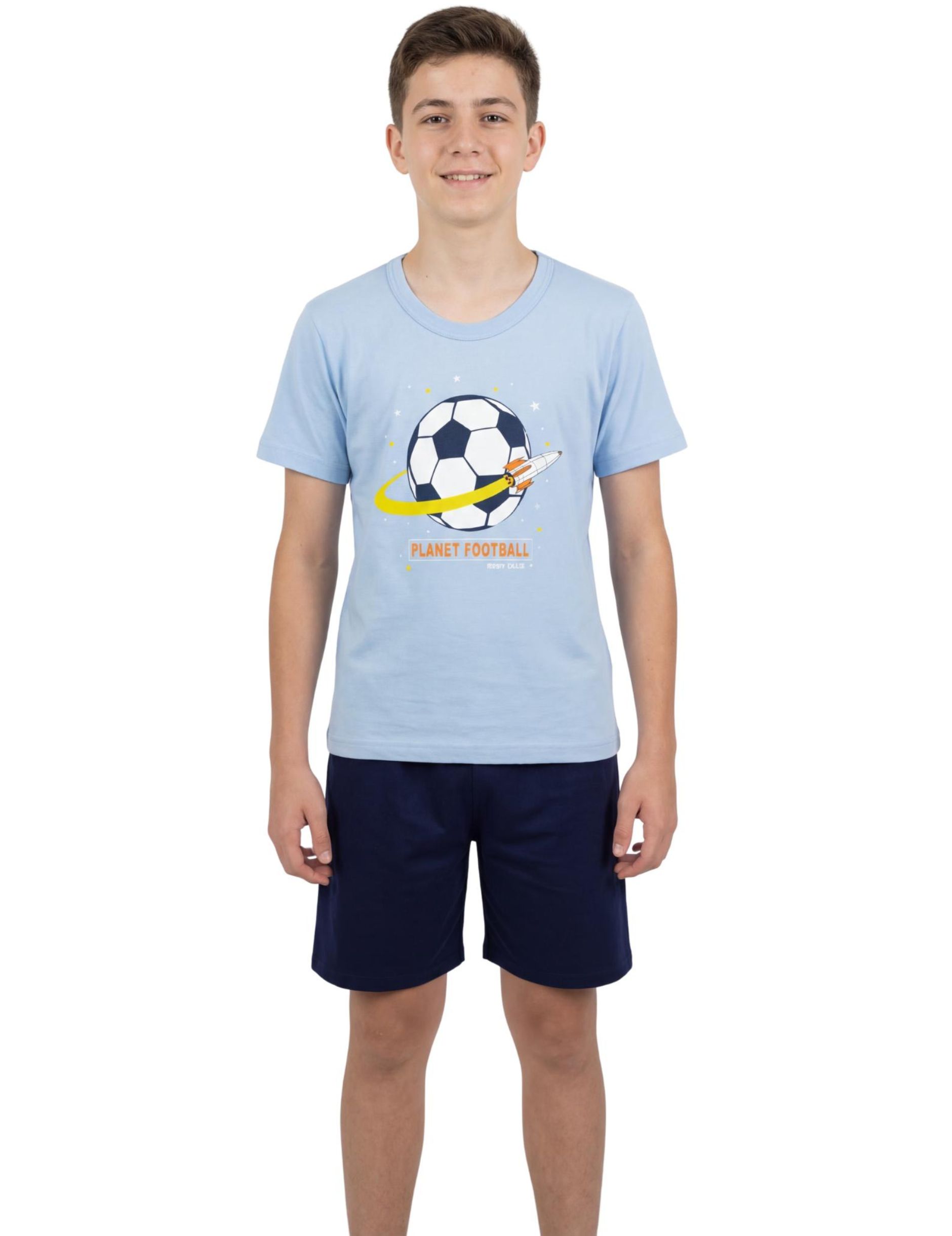 Αγορίστικο καλοκαιρινό σετ πυτζάμας Nina Club, ιδανικό για ατελείωτη άνεση και παιχνίδι. Σχεδιασμένο και ραμμένο στην Ελλάδα από 100% ποιοτικό βαμβάκι, αφήνει την παιδική επιδερμίδα να αναπνέει. Περιλαμβάνει κοντομάνικη μπλούζα σε απαλό γαλάζιο χρώμα με το χαρούμενο τύπωμα “Planet Football” και άνετο σκούρο μπλε σορτς. Μια δροσερή, ανθεκτική και γεμάτη ενέργεια επιλογή για τον ύπνο.
