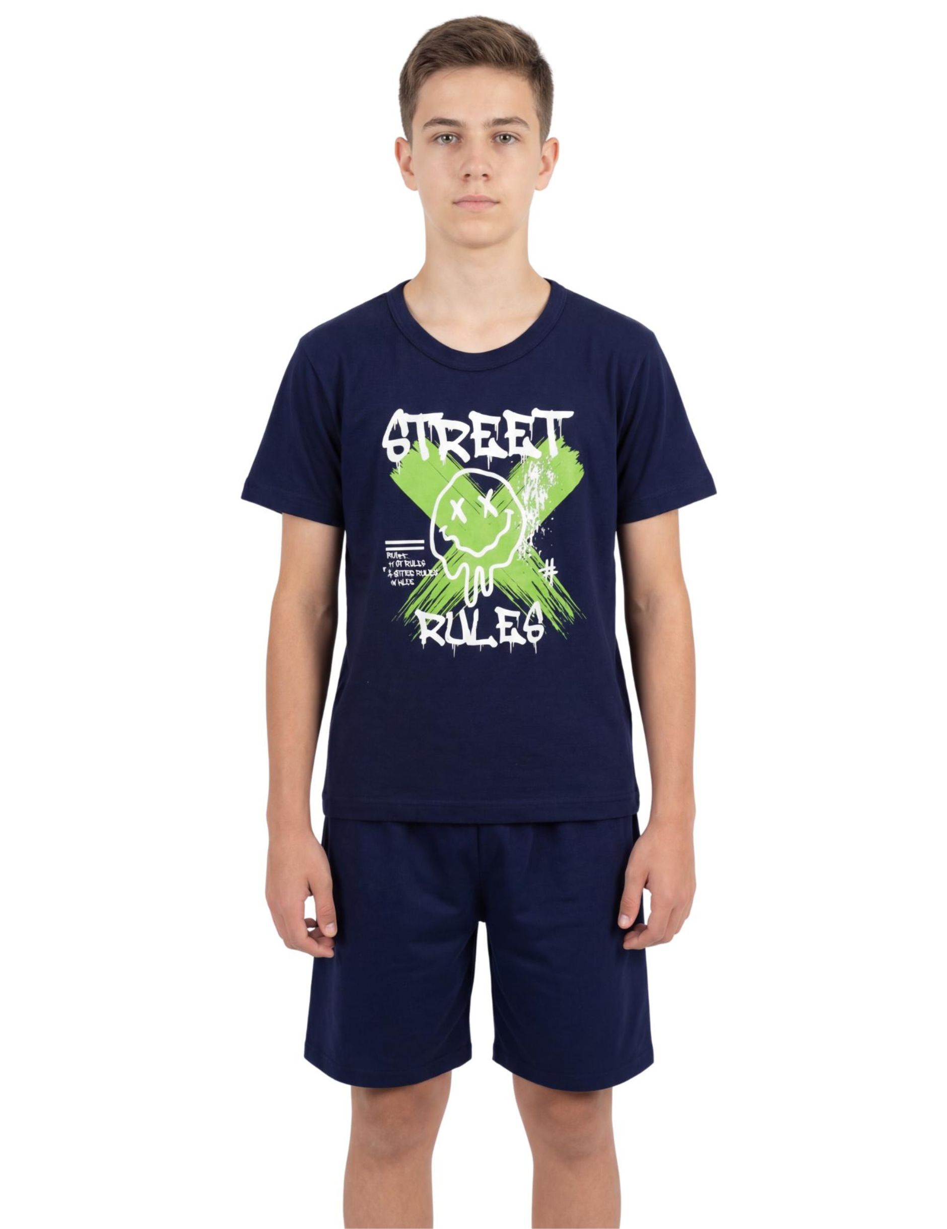 Αγορίστικο καλοκαιρινό σετ πυτζάμας Nina Club, φτιαγμένο στην Ελλάδα από 100% αγνό βαμβάκι για κορυφαία άνεση και διαπνοή. Περιλαμβάνει κοντομάνικη μπλούζα σε βαθύ μπλε χρώμα με μοντέρνο, φωσφοριζέ “Street Rules” graffiti τύπωμα και ασορτί μονόχρωμο σορτς. Μια δροσερή και στυλάτη επιλογή για τον ύπνο.