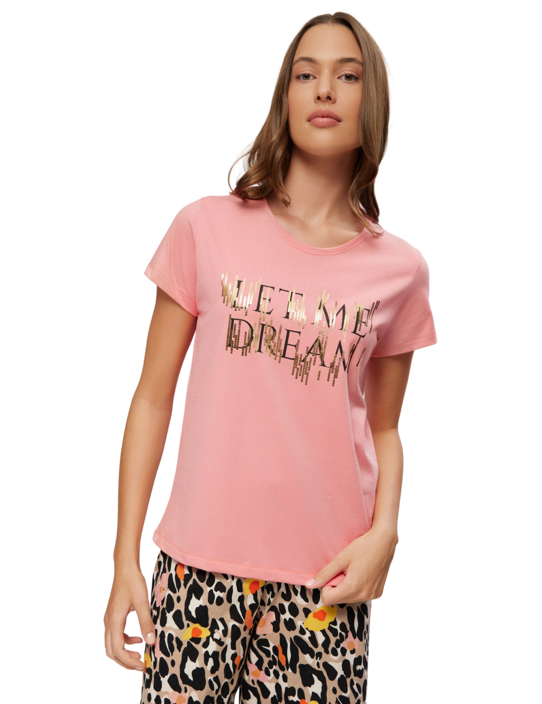 Μοντέρνα και άνετη, η ροζ πυτζάμα Minerva με στάμπα “Let Me Dream” και λεοπάρ σορτς συνδυάζει στυλ και ευχάριστη εφαρμογή. Κατασκευασμένη από 100% βαμβάκι, προσφέρει απαλή αίσθηση και δροσερή εφαρμογή για καθημερινή χαλάρωση στο σπίτι.