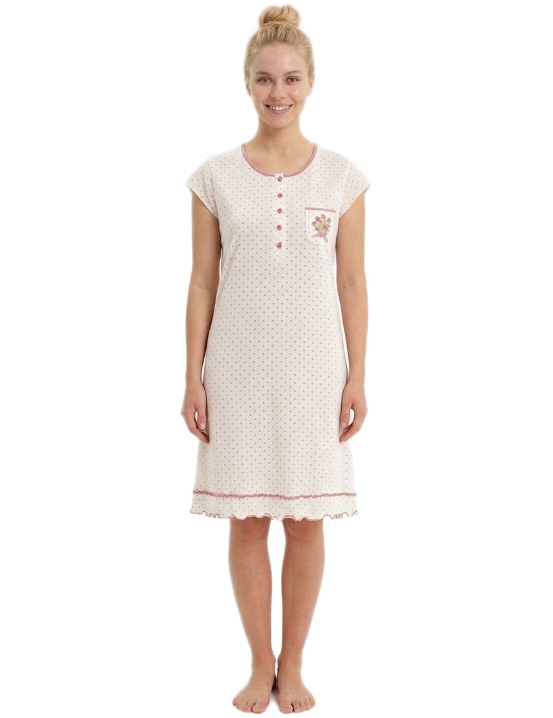 Βαμβακερό Νυχτικό με Κοντό Μανίκι – Εκρού Πουά με Κουμπιά & Τσεπάκι 2184